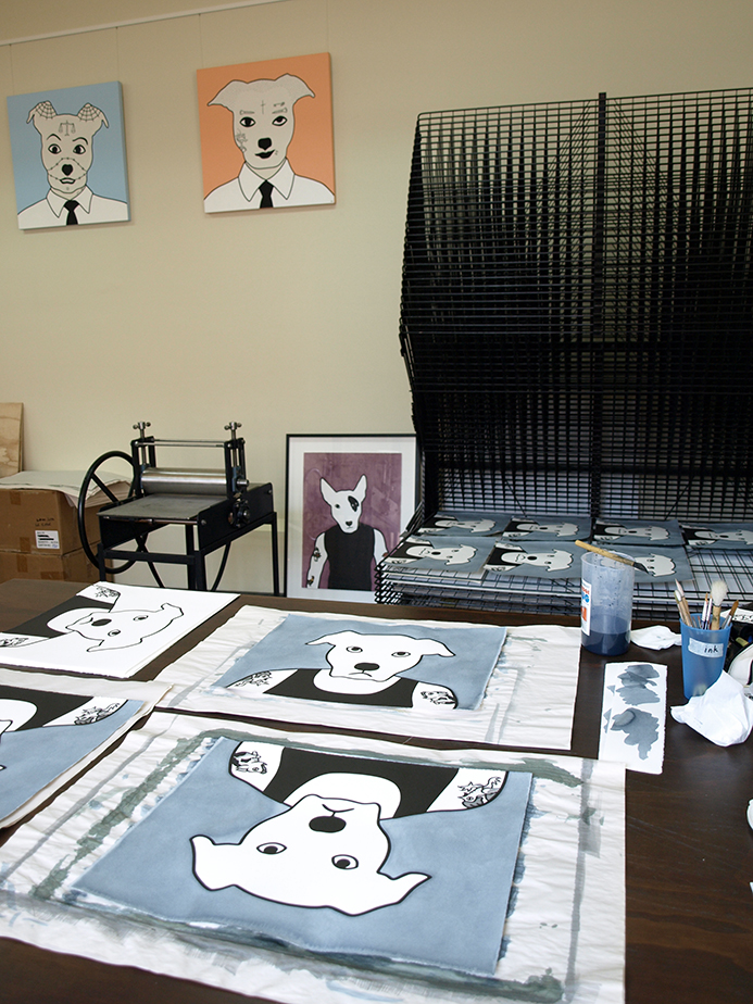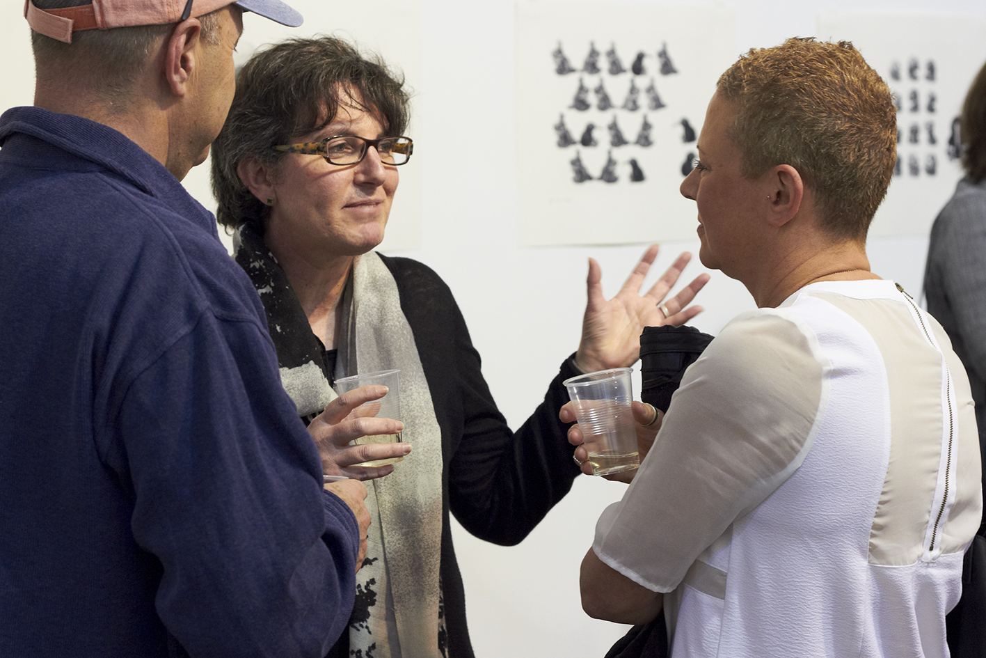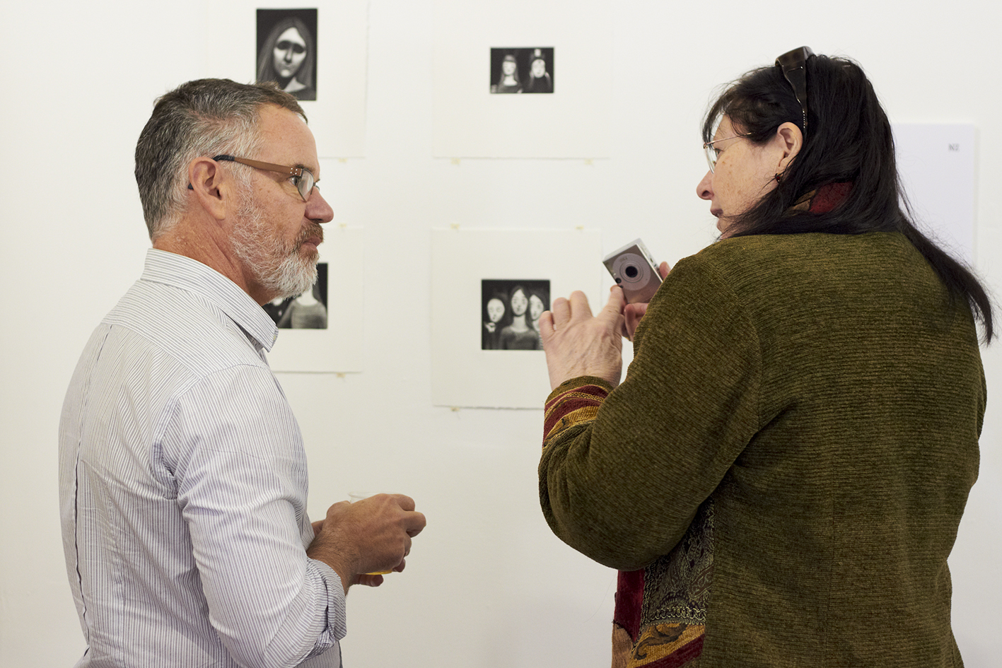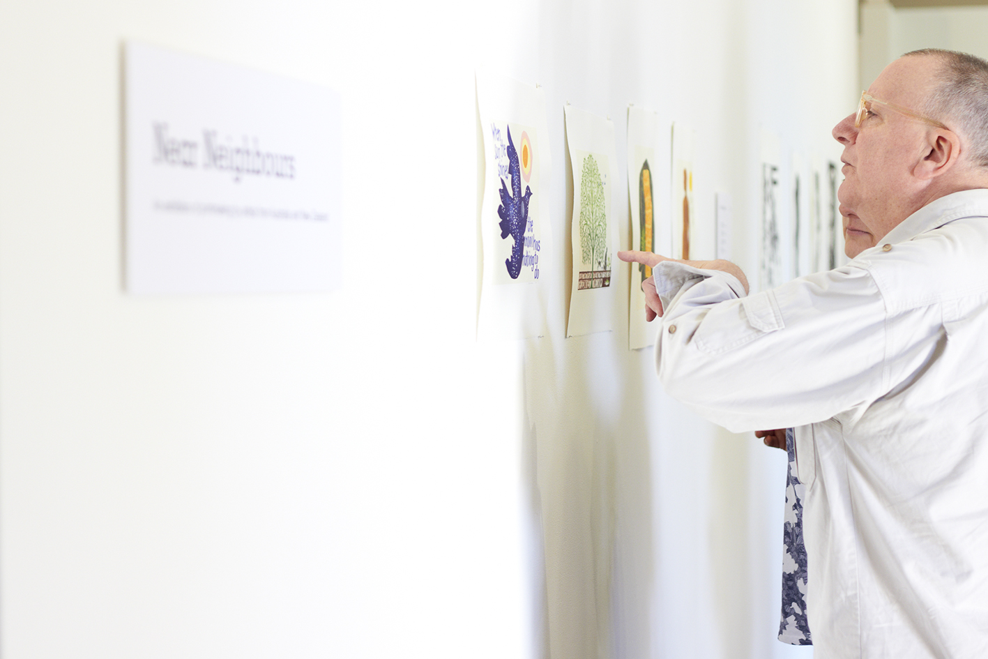 Near Neighbours at St Heliers Street Gallery, Abbotsford Convent with hand coloured linocuts by Rona Green in the background (Photography by Jessika K)
