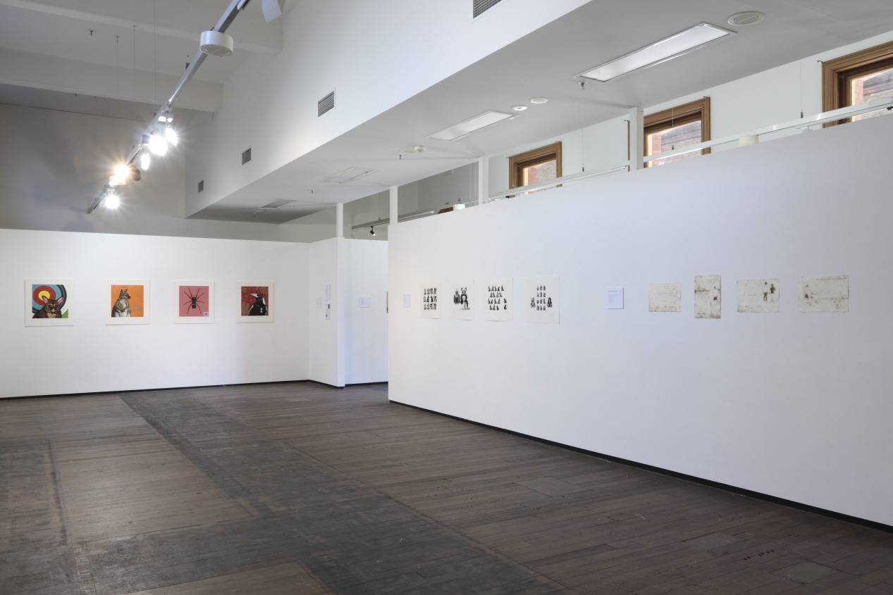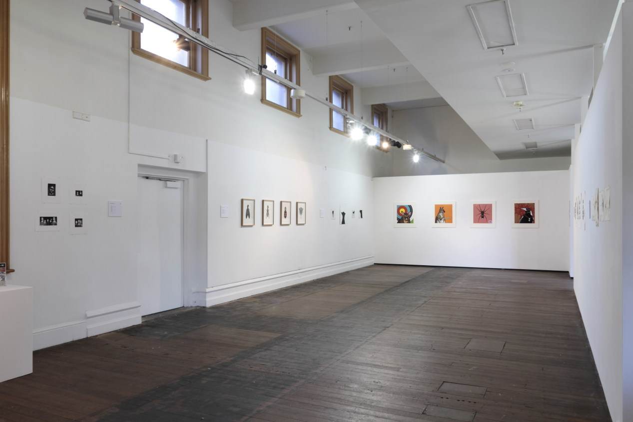 Near Neighbours at St Heliers Street Gallery – left to right: prints by Deborah Klein, John Callaghan, John Ryrie, and Alexis Neal (Photography by Tim Gresham)