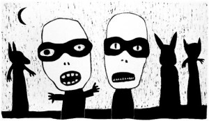 By Rona Green: ‘Archie’, 2012, hand coloured linocut; ‘The Baron of G block’, 2013, pen and ink drawing; ‘Borislav’, ‘Lazer’ and ‘Leonty’, 2013, hand coloured linocuts; ‘Party Pie’, 2013, pen and ink drawing; ‘Nekromancer’, 2012, hand coloured linocut