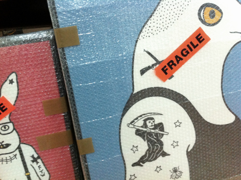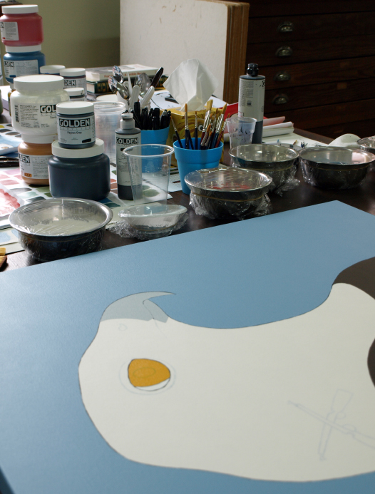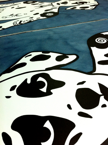 A: Ever since I can remember, making any kind of art has enabled me to retreat from the world and create my own. I can’t imagine not having a ‘soundtrack’ to this. I think in art school I garnered a reputation as being busy and unapproachable due to the music driven print frenzies I’d get in to. At the moment it’s Frank Sinatra on the way to the studio and then something like Dirty Three or Godspeed You! Black Emperor.